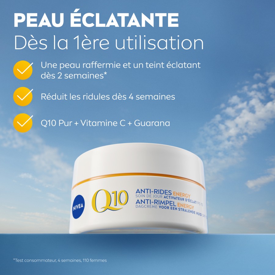 Crème de jour NIVEA Q10 Energy FPS 15 au Q10, vitamine C et guarana, active l'éclat et réduit les signes de fatigue dès 2 semaines. Pot 50ml.
