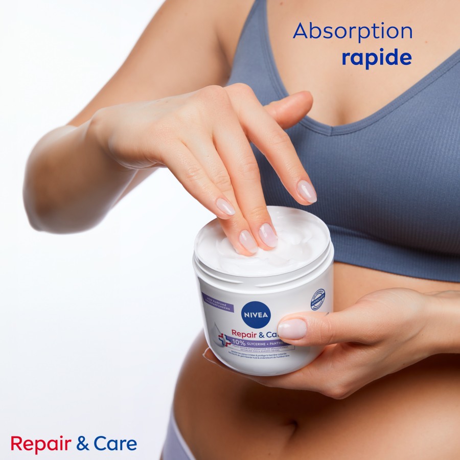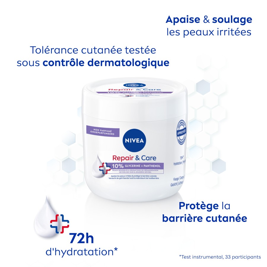 Crème NIVEA Repair & Care sans parfum au panthenol et glycérine pour peaux sensibles et sujettes aux démangeaisons, 72h d'hydratation. Pot 400ml.