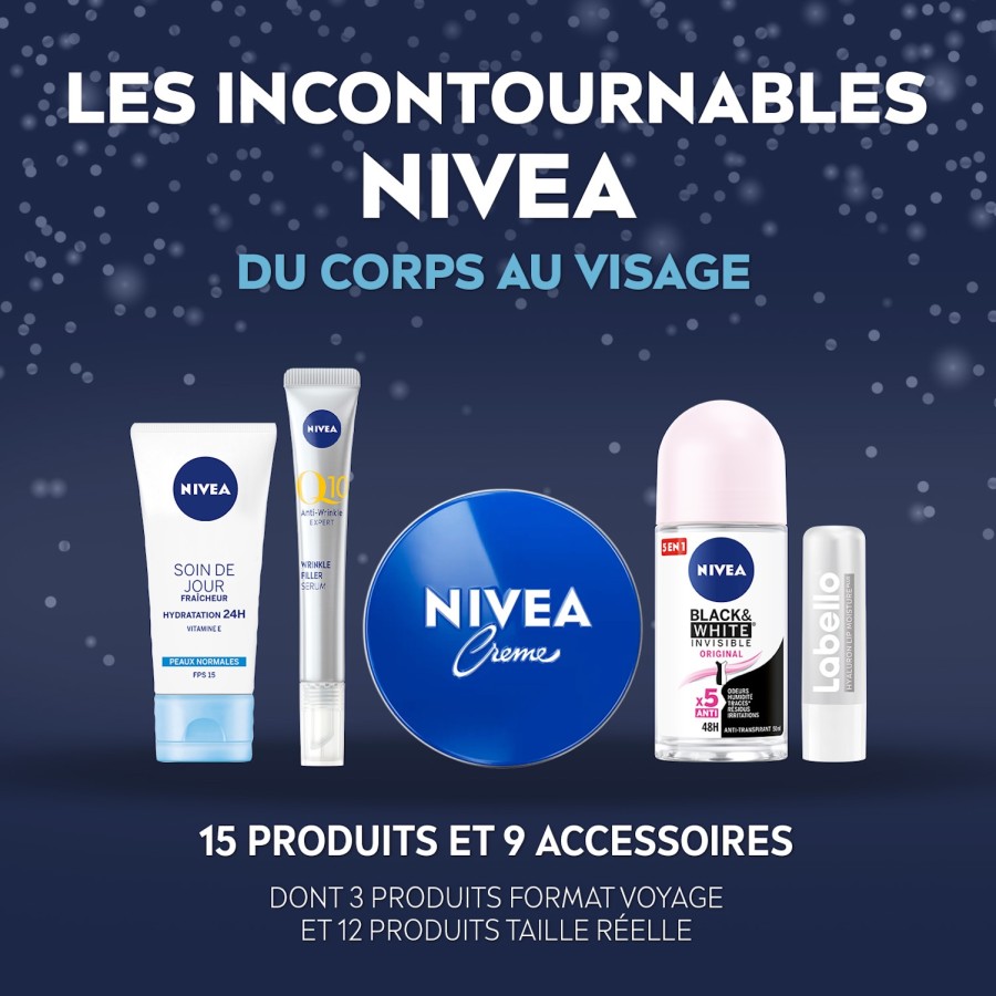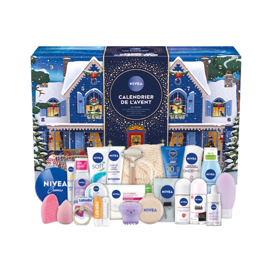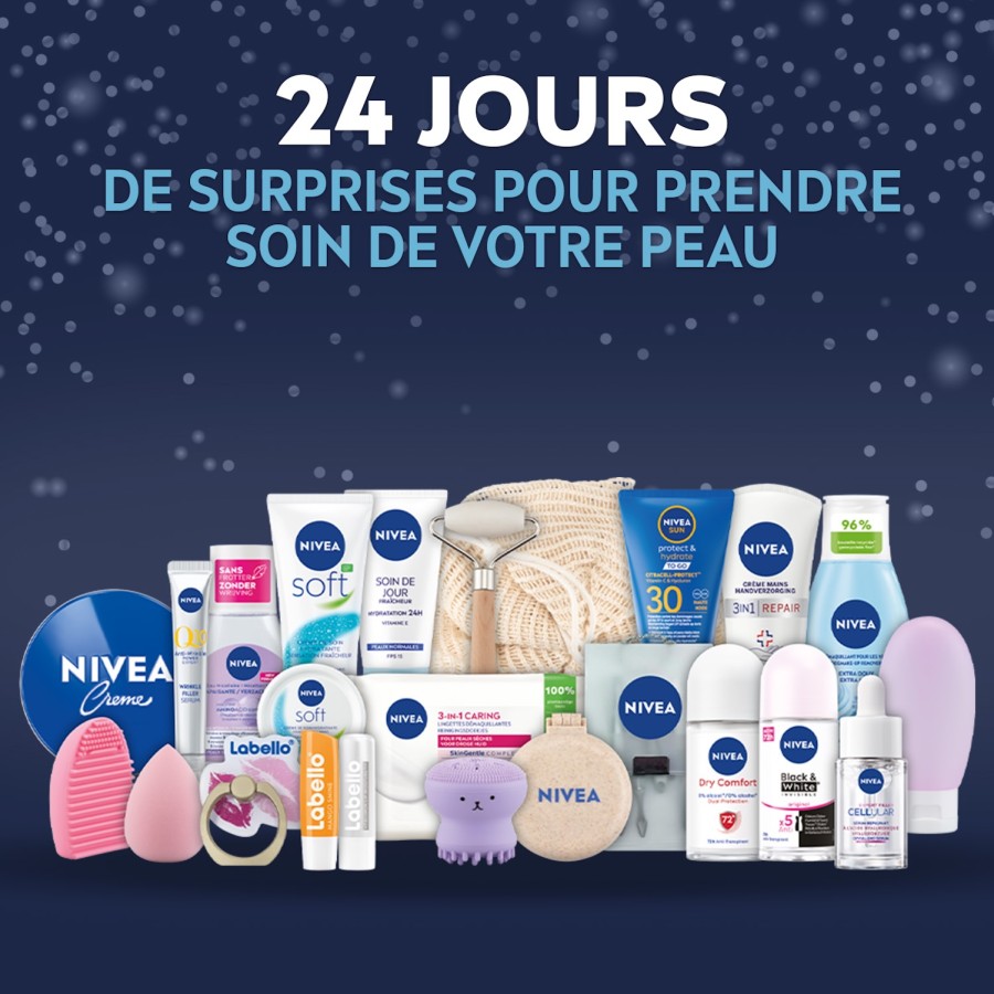 Comment rendre l’attente jusqu'à Noël encore plus excitante ? Avec le Calendrier de l’Avent Femme NIVEA 2025 ! Découvrez 24 surprises de soins et accessoires pour le visage, le corps et les lèvres. Avec 15 produits et 9 accessoires, il vous offre une expérience beauté chaque jour. À offrir ou à garder pour soi, c’est la promesse de 24 moments de plaisir jusqu'au 24 décembre ! Pssst... Pour les plus curieux, le Calendrier de l'Avent NIVEA Édition 2025 contient : 15 produits incontournables NIVEA : 1 x 15 ml Sérum, 1 x 50 ml Soin Jour 24H, 1 x 125 ml Démaquillant Yeux Doux, 1 x 100 ml Eau Micellaire Peaux Sensibles, 20 x Lingettes Démaquillantes Douceur, 1 x 150 ml Crème NIVEA, 1 x 75 ml Soft Tube, 1 x 50 ml Soft Pot, 1 x 15 ml Combeur de Rides Q10, 1 x 50 ml Bille Féminin Dry Comfort, 1 x 50 ml Bille Féminin Black & White Original, 1 x 75 ml Crème Mains Repair 3-en-1, 1 x Labello Acide Hyaluronique, 1 x Labello Mango Shine, 1 x 50 ml Lait Protect & Hydrate. 9 accessoires beauté : Rouleau Visage, Nettoyant pour le Visage, Anneau Attache Téléphone, Nettoyant pour Pinceaux, Set Manucure, Éponge de Douche, Beauty Blender, Mini Brosse à Cheveux, Flacon de Voyage.