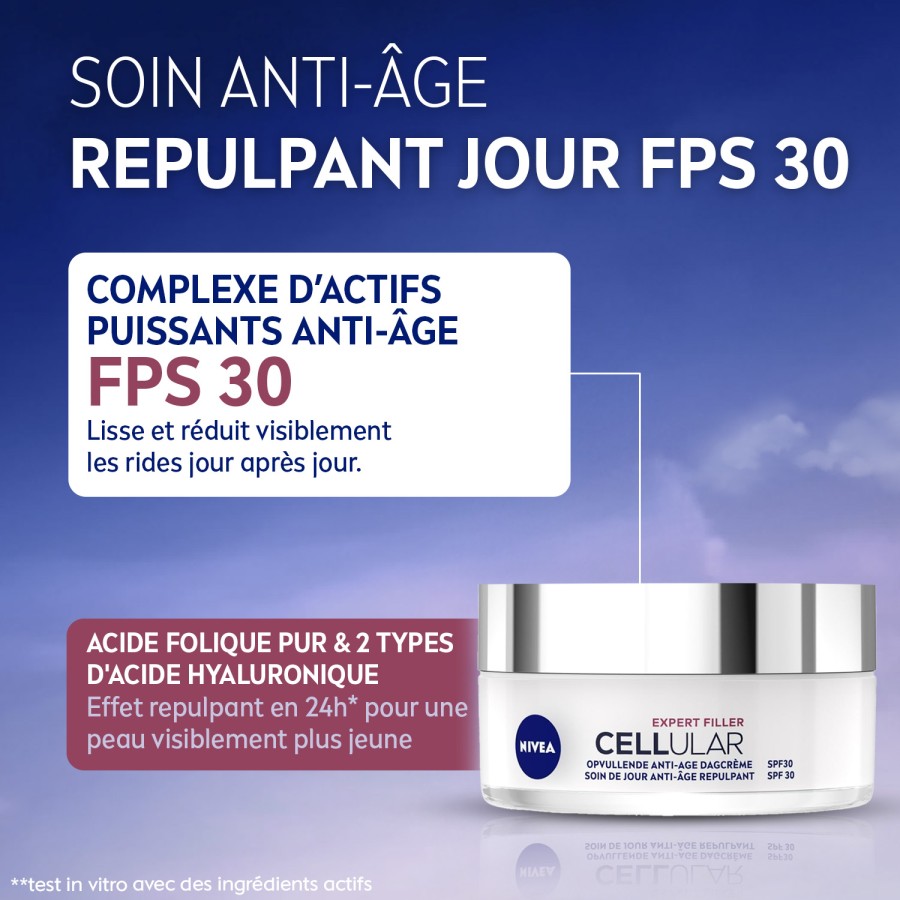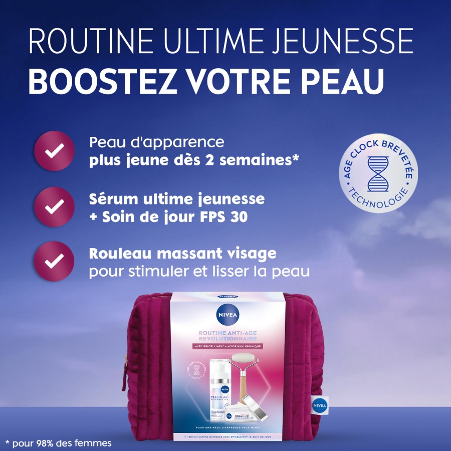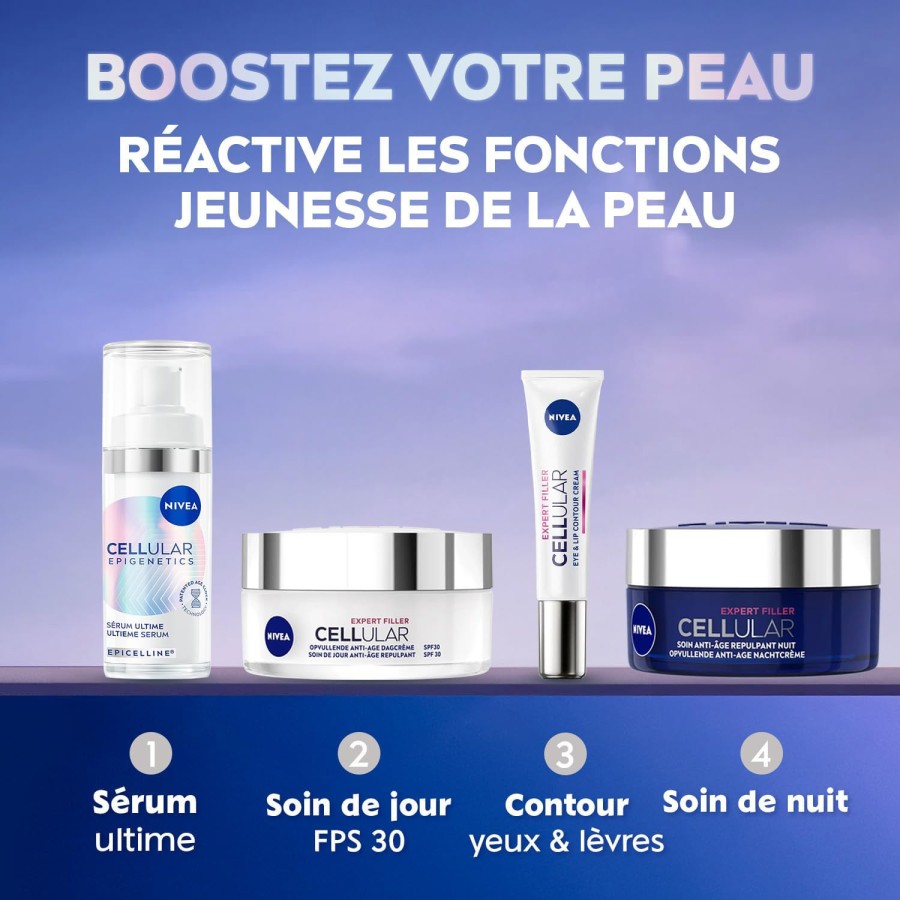 - TROUSSE ANTI AGE REVOLUTIONNAIRE : La trousse NIVEA contient deux essentiels anti-âge : le Serum Epigenetics et la Crème de Jour Cellular Expert Filler FPS 30. Ensemble, ils agissent pour hydrater, lisser la peau et réduire visiblement les rides.