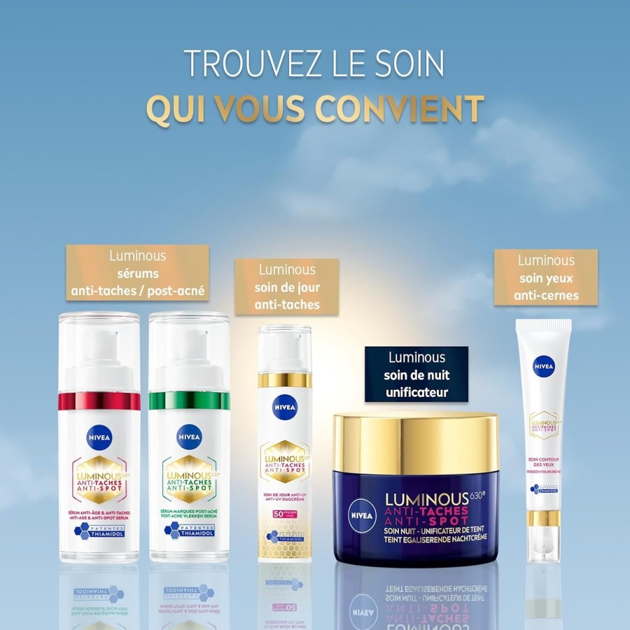 Après 10 ans de recherche, les laboratoires NIVEA ont découvert un ingrédient très efficace qui a été breveté : Le Thiamidol®. Il agit au niveau cellulaire en harmonie avec la peau pour réduire les taches en agissant sur la pigmentation existante. La nouvelle formule du Soin de Nuit Anti-taches NIVEA au Thiamidol® et Acide Hyaluronique, réduit les taches liées à l'âge pour un teint plus uniforme et des rides comblées.