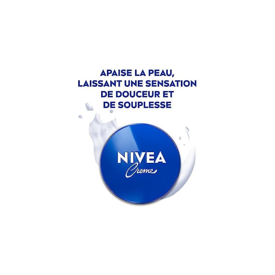Depuis plus de 100 ans, NIVEA Creme protège et nourrit tous les types de peaux, à tout âge. Sa formule est enrichie en Eucerit pour hydrater et nourrir intensément votre corps, votre visage et vos mains. Dès la première application, sa texture riche et crémeuse laisse votre peau douce et nourrie et protège la barrière protectrice de la peau. NIVEA Creme est un soin non comédogène et peut être utilisée de manière quotidienne. C’est la crème idéale pour prendre soin de toute la famille (dès 3 ans). Sa boîte en aluminium est faite de 80% d’aluminium recyclé. Tolérance cutanée testée sous contrôle dermatologique.