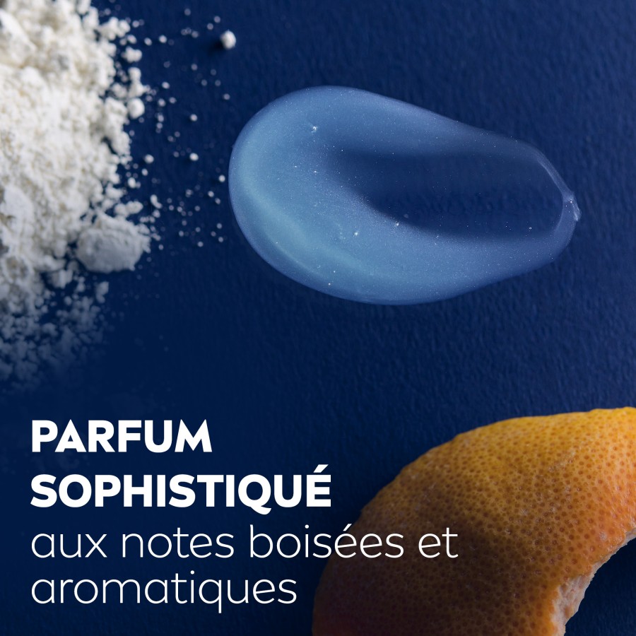 Gel douche 3-en-1 NIVEA MEN Deep à l'argile microfine, nettoyage en profondeur corps, visage et cheveux, pH neutre. Flacon 250ml recyclé.