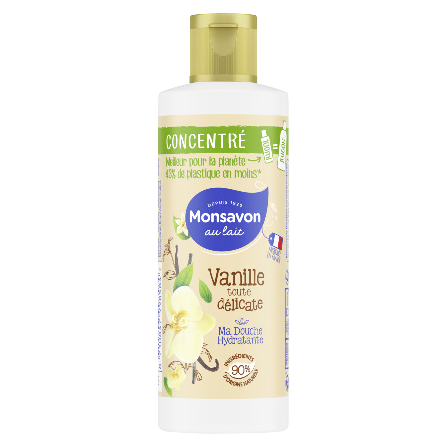 les douches hydratantes Concentrées Monsavon ce sont toujours des formules aussi parfumées, composées de 90% d’ingrédients d’origine naturelle et d’une goutte de lait pour la touche douceur, mais c’est aussi un bon geste pour la planète puisque le format Monsavon concentré 100ml offre un emballage qui contient 43% de plastique en moins*, pour autant d’utilisations et de plaisir qu’avec un gel douche 300ml ! Aussi, nos produits Monsavon sont fabriqués en France, à Le Meux (60) et sont 100% recyclables!