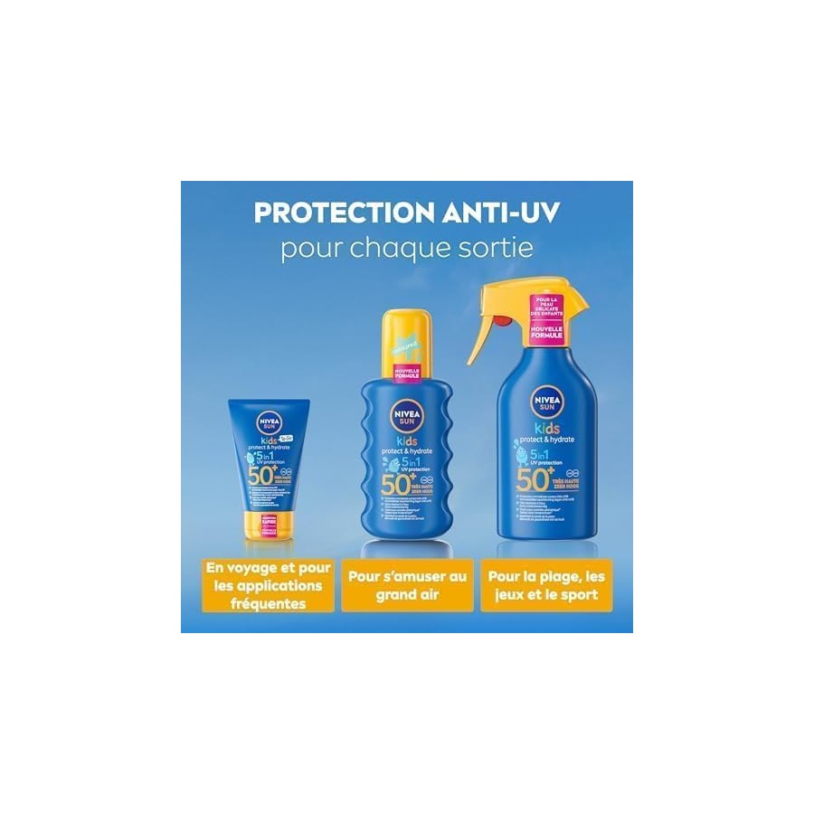 Le Pistolet Solaire Protect & Hydrate Kids FPS 50+ de NIVEA SUN, protection solaire 5 en 1, a une formule soin qui protège la peau fragile des enfants et qui procure une hydratation longue durée pour une peau particulièrement douce. Sa protection UVA/UVB très hautement efficace protège la peau des coups de soleil et des dommages cutanés à long terme. Elle aide à minimiser le risque de réactions cutanées dues au soleil. Son format pistolet permet une application facile et ludique. Absorption rapide. Extra-résistant à l'eau.