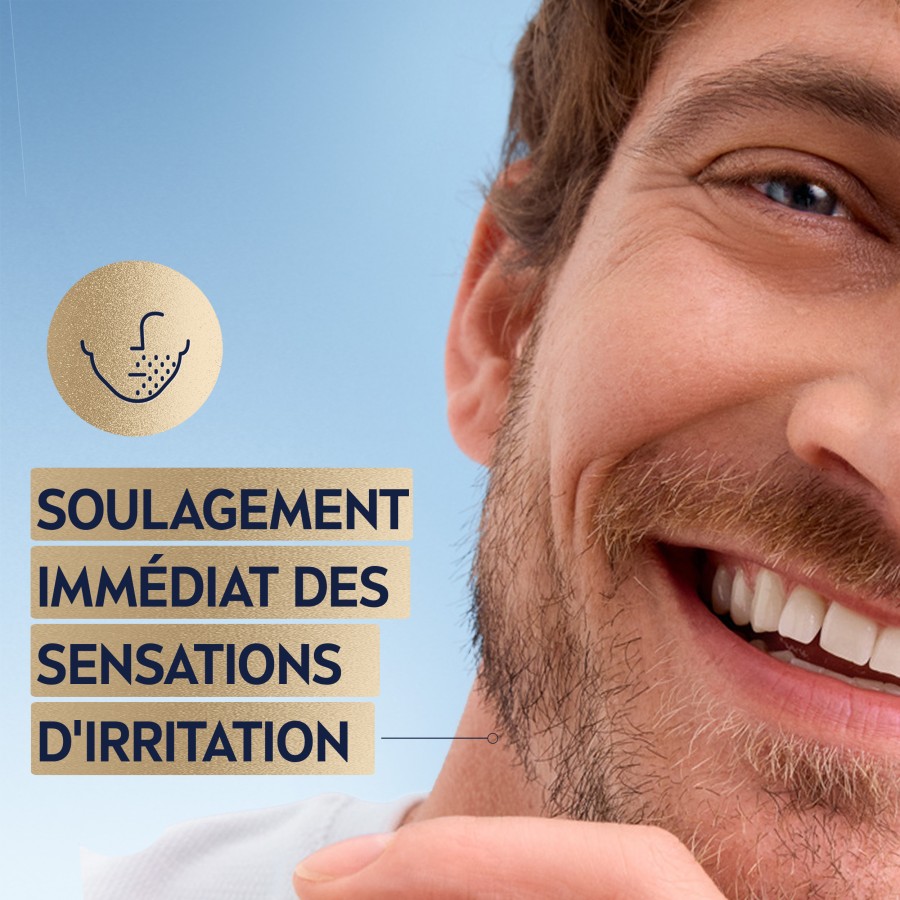 Grâce à sa formule enrichie en extrait de Camomille, de Vitamine E, de Pro-Vitamine B5 et 0% d'alcool*, la peau et la barbe retrouve les 5 signes d'apparence correspondant à une peau saine et une barbe soignée ; soulagement immédiat des sensations d'irritation, hydratation 24 heures**, barbe lisse sans résidus de gel-crème, peau moins sensible grâce à une utilisation régulière, confort quotidien de la peau.