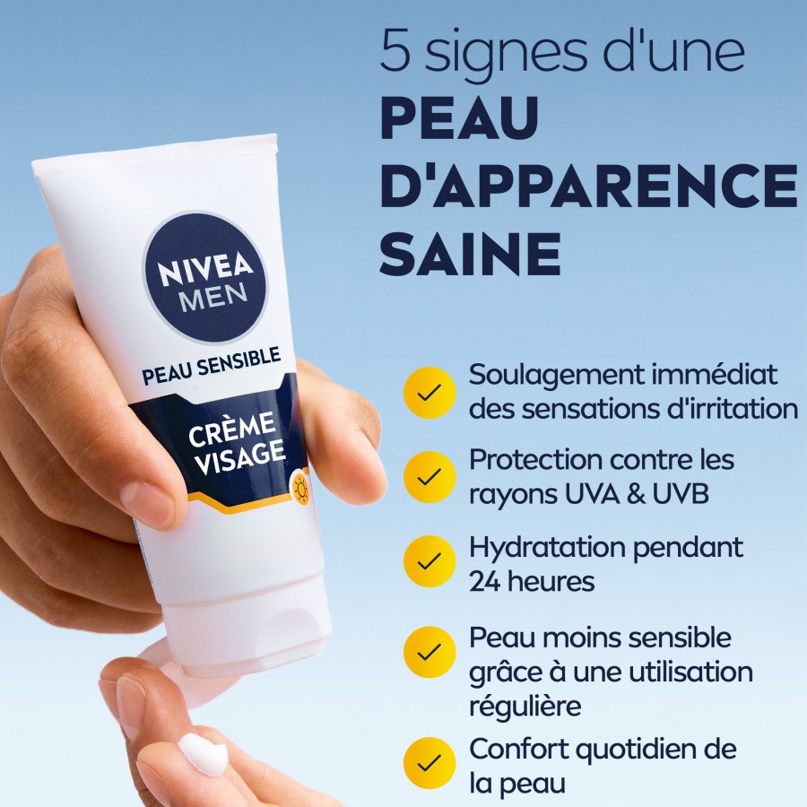 La crème visage SPF15 PEAU SENSIBLE NIVEA MEN protège votre peau des rayons UVB et UVA, aidant ainsi à prévenir les brûlure liées au soleil. Conçue spécialement pours les hommes à la peau sensible, irritée et souhaitant être protégée des rayons du soleil.