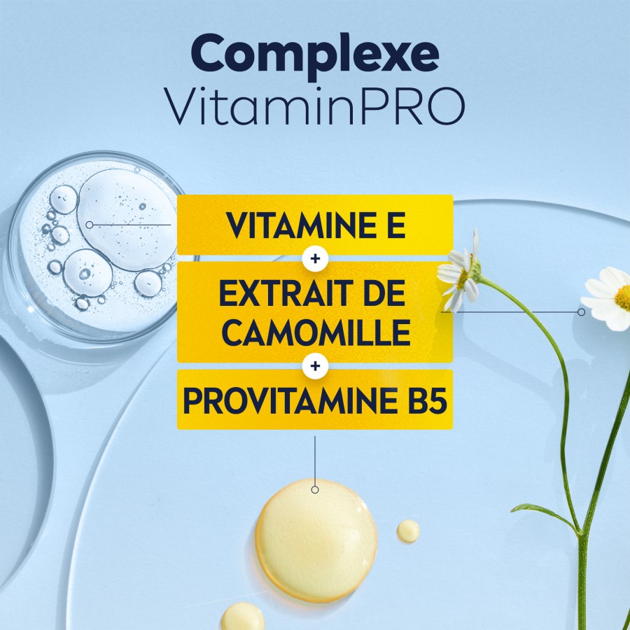 Sa texture légère sans alcool* est enrichie d'un complexe VItaminePRO (Vitamine E, Provitamine B5, extrait de Camomille). Son fini non gras, collant et invisible permet une absorbation rapide, ne laissant aucuns résidus sur la peau.