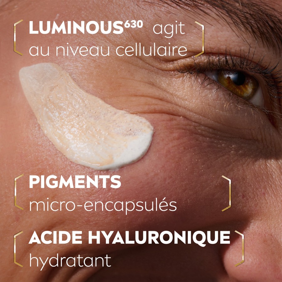 2. RÉDUIT : La formule légère avec du LUMINOUS630® réduit l'intensité des taches brunes dès 2 semaines (auto-scorage, 50 femmes) et améliore l'uniformité du teint de 40% en 8 semaines*.