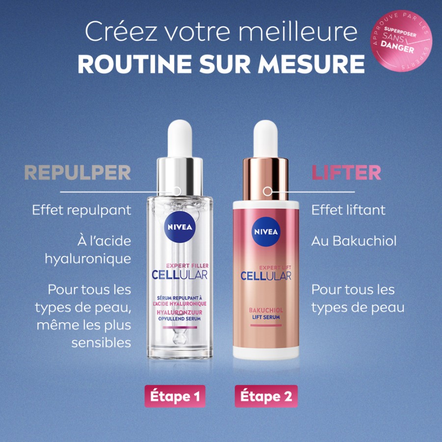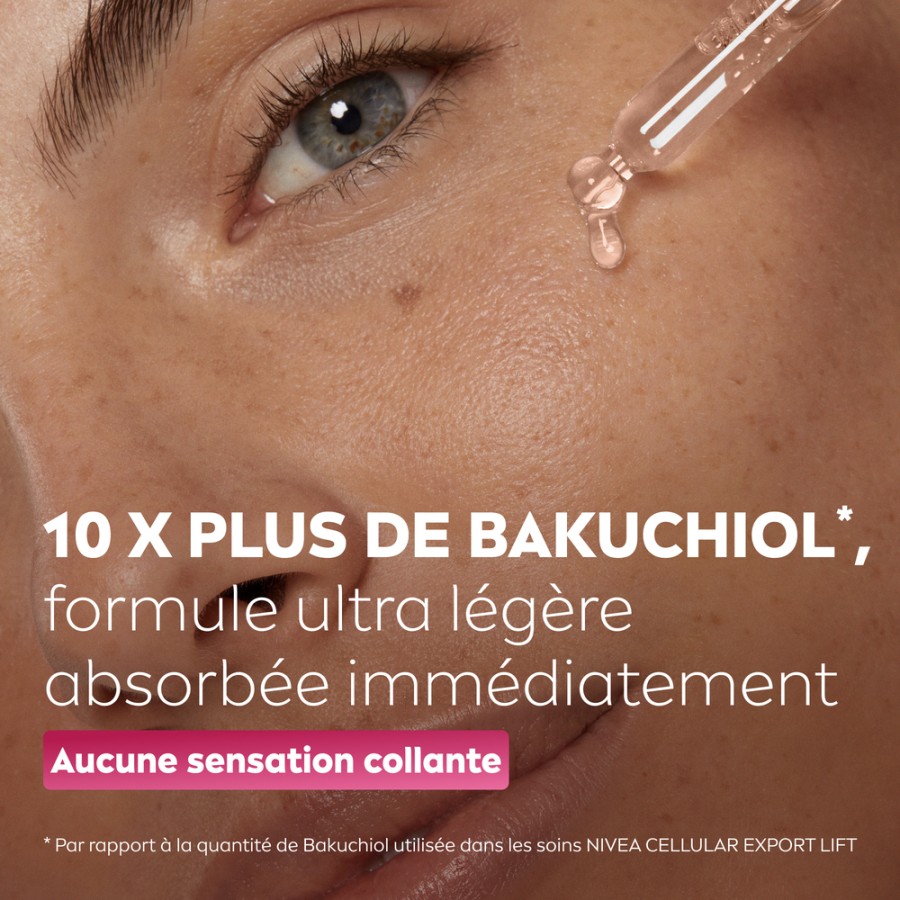 Sérum NIVEA Cellular Lift au Bakuchiol pur haute concentration, stimule le collagène et raffermit la peau pour un effet liftant visible. 30ml.