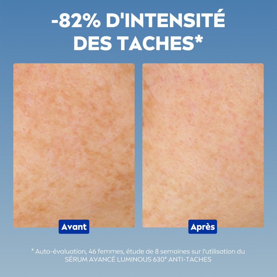 Après 10 ans de recherche, les laboratoire NIVEA ont découvert un ingrédient puissant et breveté : LUMINOUS630®. Il agit sur la pigmentation existante de la peau pour éclaircir les taches brunes, réduire leur taille et prévenir l'apparition de nouvelles. Le Soin de Jour Protecteur FPS50 NIVEA LUMINOUS630® ANTI-TACHES agit sur la pigmentation existante pour réduire les taches brunes, prévient leur réapparition et protège du photo-vieillissement. Sa formule légère enrichie en Acide Hyaluronique, Vitamine E et filtres UVA/UVB améliore la texture de la peau et offre une action matifiante tout en délivrant une haute protection contre le soleil. Pour un teint unifié et lumineux. Testé sous contrôle dermatologique et convient à tous les types de peaux y compris les peaux sensibles. Pour un résultat optimal et une routine anti-taches complète, appliquez tous les matins sur le visage préalablement nettoyé et utilisez-le en combinaison avec le Sérum Correcteur Anti-taches NIVEA LUMINOUS630®.