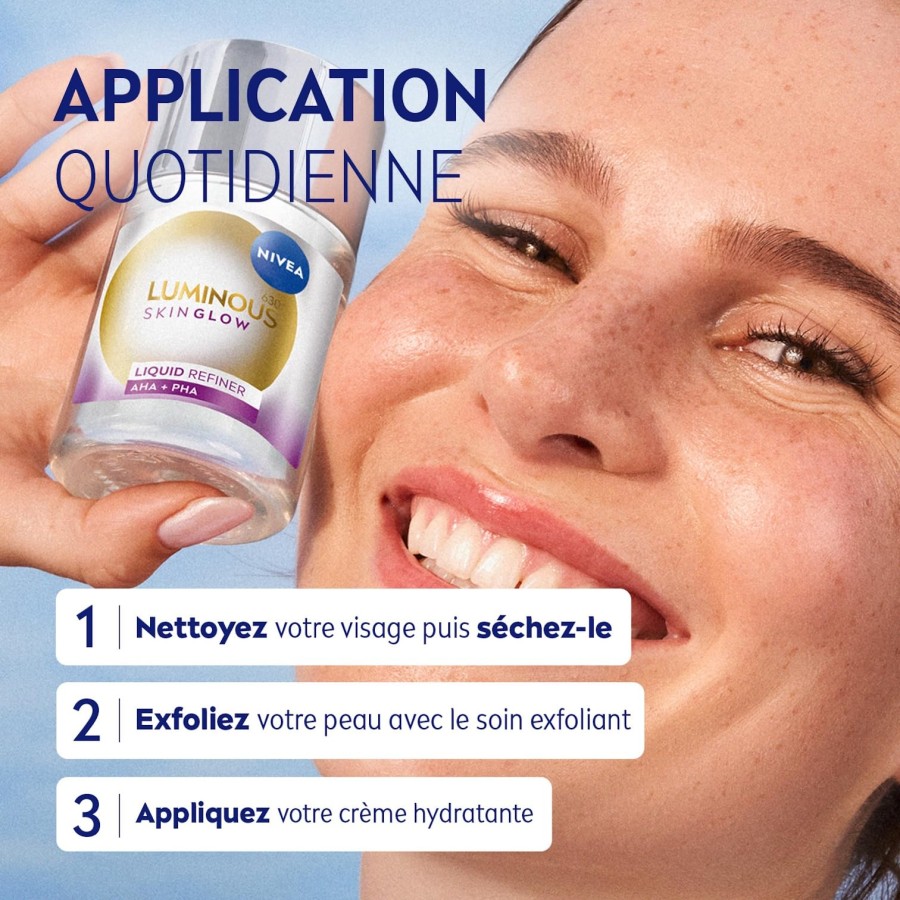Exfoliant liquide NIVEA LUMINOUS Skin Glow aux 4% AHA et 1% PHA, peeling sans rinçage qui unifie le teint et affine le grain de peau dès 7 jours. 100ml.